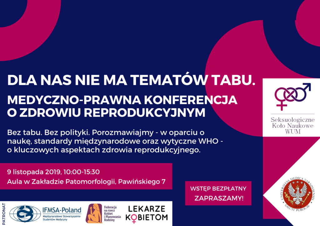 Konferencja „Dla nas nie ma tematów tabu. Medyczno-prawna konferencja o zdrowiu reprodukcyjnym” odbędzie się w sobotę 9 listopada 2019 r., w godz. 10:00-15:30, w Auli Katedry i Zakładu Patomorfologii WUM, ul. Pawińskiego 7. W trakcie bezpłatnej konferencji organizatorzy zapewniają lunch, kawę i herbatę.